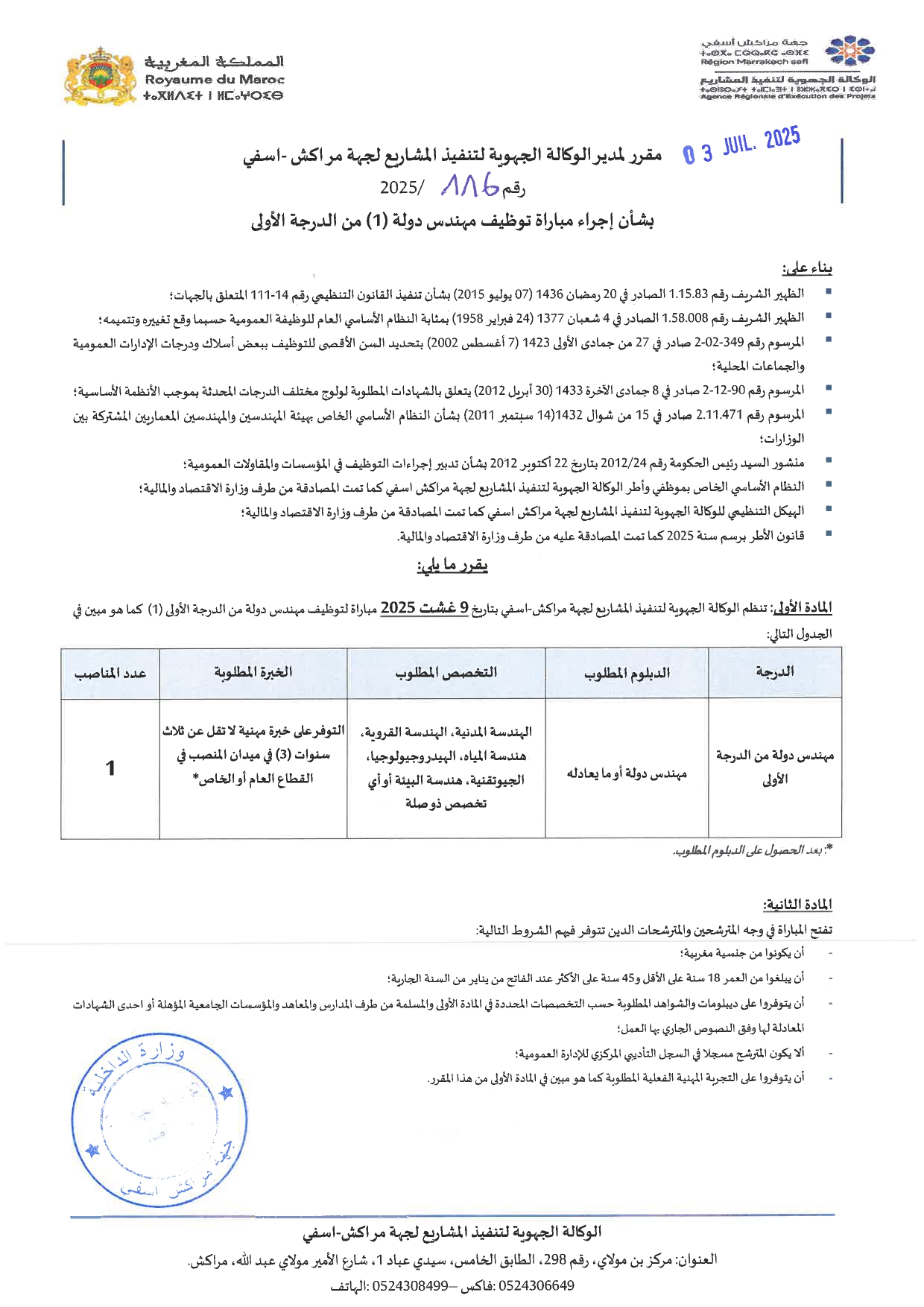 تنظم الوكالة الجهوية لتنفيذ المشاريع لجهة مراكش آسفي (AREP) مباريات لتوظيف 4 مناصب برسم سنة 2025 موزعة كالتالي: