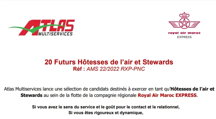 Atlas Multiservices lance une sélection de candidats destinés à exercer en tant qu’Hôtesses de l’air et Stewards au sein de la flotte de la compagnie régionale Royal Air Maroc EXPRESS.