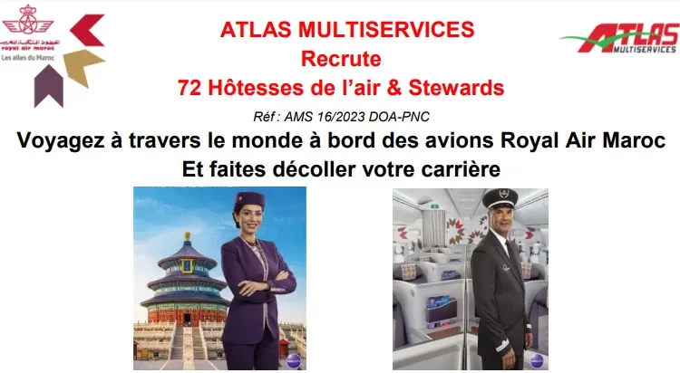 تعلن أطلس مولتي سيرفيس عن مباراة توظيف مضيفي ومضيفات الطيران بالخطوط الملكية المغربية (72 منصب) آخر أجل هو 27 مارس 2023.
