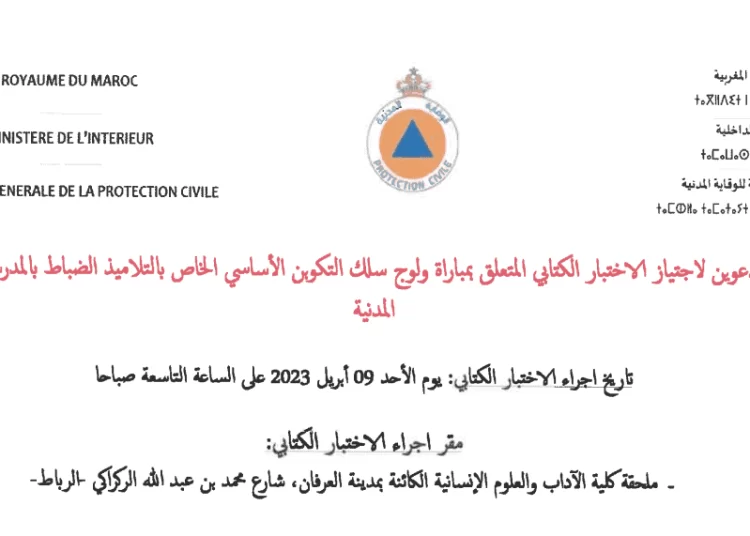 تاريخ اجراء الاختبار الكتابي: يوم الأحد 09 أبريل 2023 على الساعة التاسعة صباحا