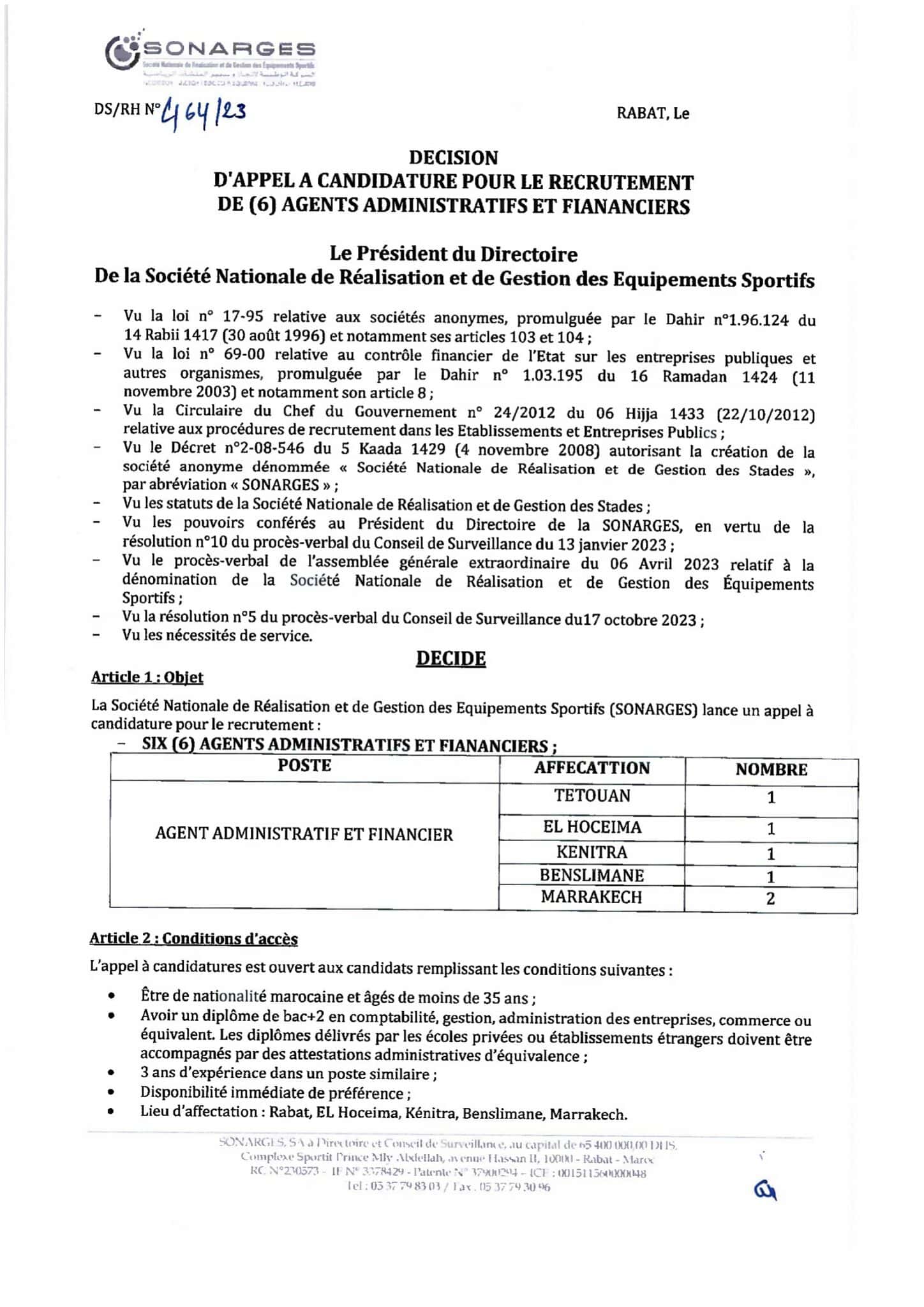 مباراة توظيف 6 تقنيين إداريين وماليين بالشركة الوطنية لإنجاز وتدبير المنشآت الرياضية SONARGES recrute des Agents Administratifs et Financiers آخر أجل هو 27 دجنبر 2023