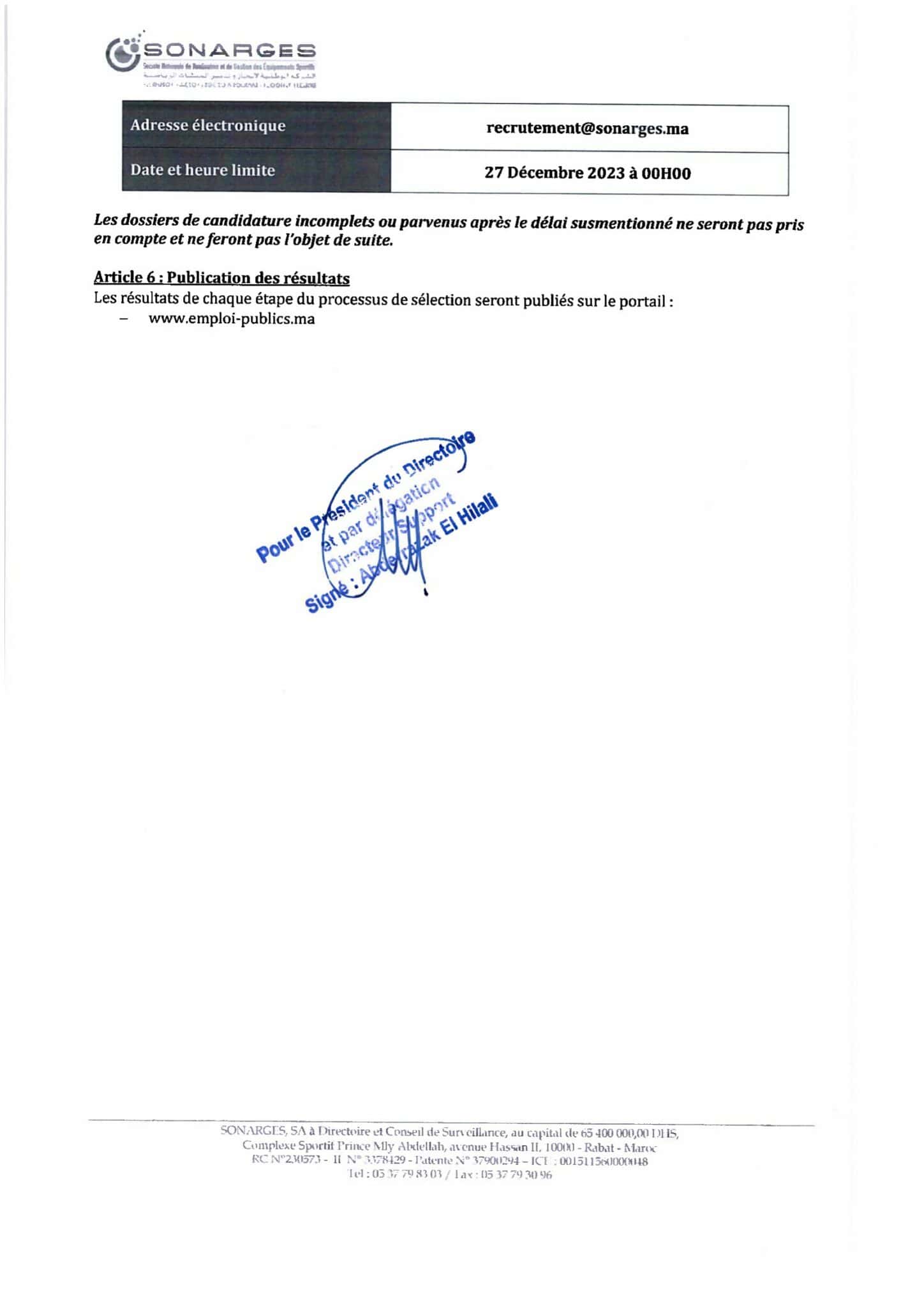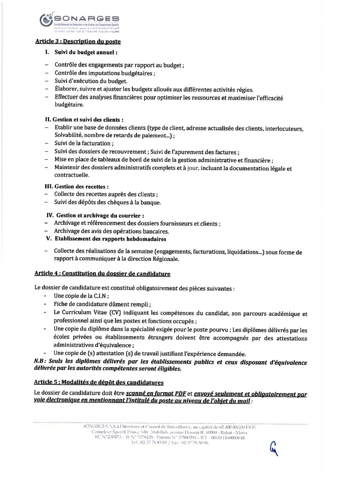 Le dossier de candidature doit être scannée en format PDF et envoyé seulement et obligatoirement par voie électronique en mentionnant l’intitulé du poste au niveau de l’objet à l’adresse email suivante: recrutement@sonarges.ma