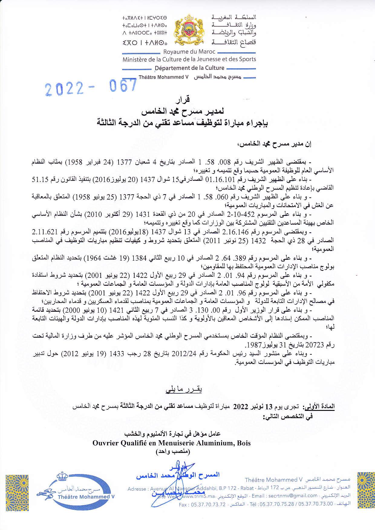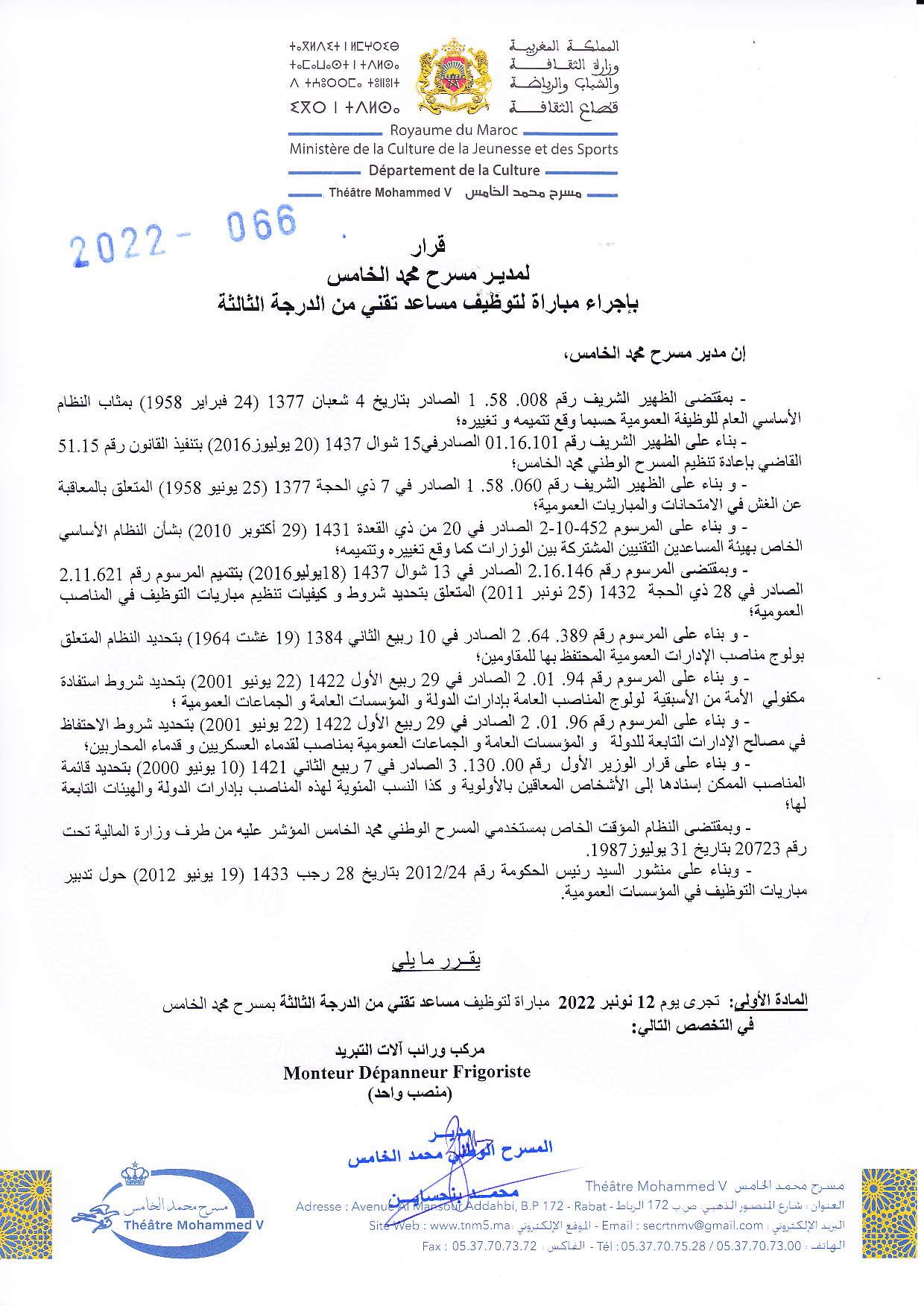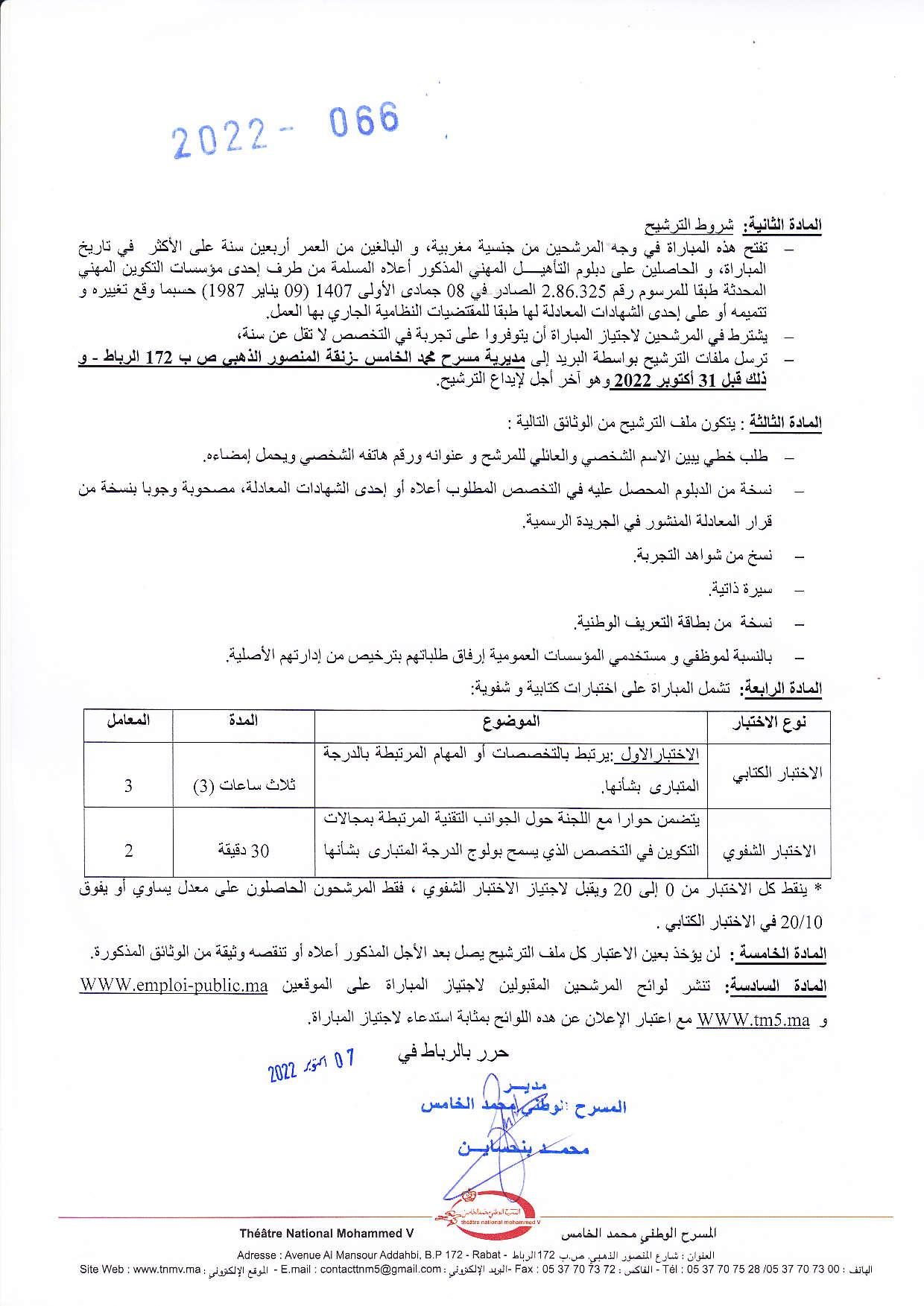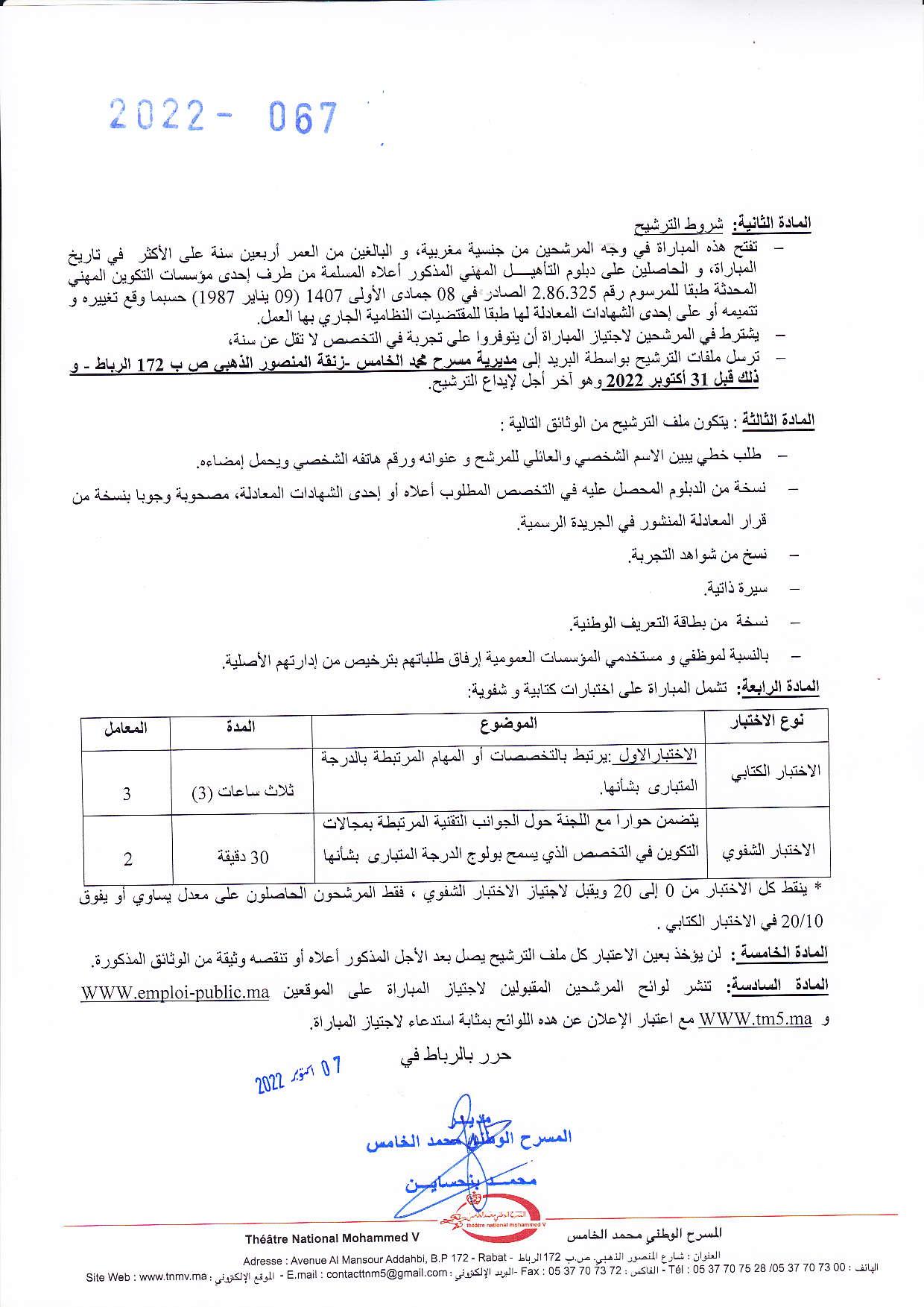 مباراة التوظيف بمسرح محمد الخامس في درجة مساعد تقني من الدرجة الثالثة سلم 6 (2 مناصب). آخر أجل هو 31 اكتوبر 2022