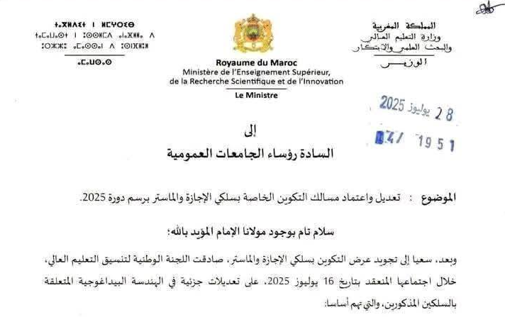 تعديل واعتماد مسالك التكوين الخاصة بسلكي الإجازة والماستر 2025-2026: في خطوة تهدف إلى الارتقاء بجودة التعليم العالي في المغرب، أعلنت وزارة التعليم العالي والبحث العلمي والابتكار عن تعديلات واعتمادات جديدة في مسارات التكوين لبرنامجي الإجازة والماستر. جاء هذا القرار بعد مصادقة اللجنة الوطنية لتنسيق التعليم العالي على تعديلات جزئية في الهندسة البيداغوجية لهذين السلكين خلال اجتماعها المنعقد في 16 يوليو 2025.