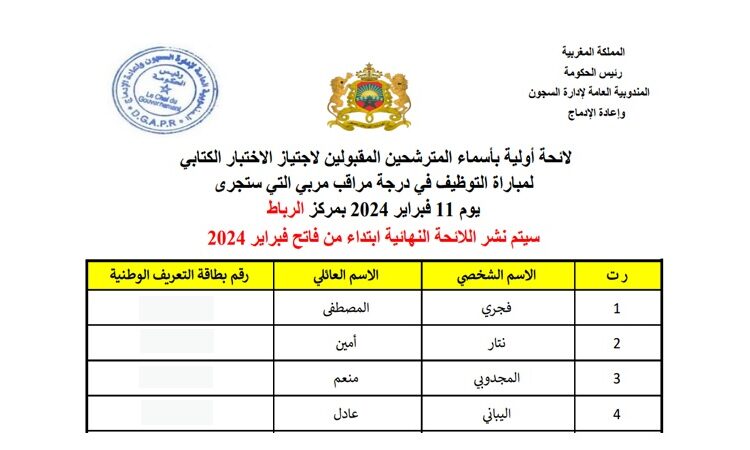 الائحة الأولية لأسماء المترشحين المقبولين لاجتياز الاختبار الكتابي لمباراة توظيف 941 مراقب مربي المندوبية العامة لإدارة السجون وإعادة الإدماج 2024