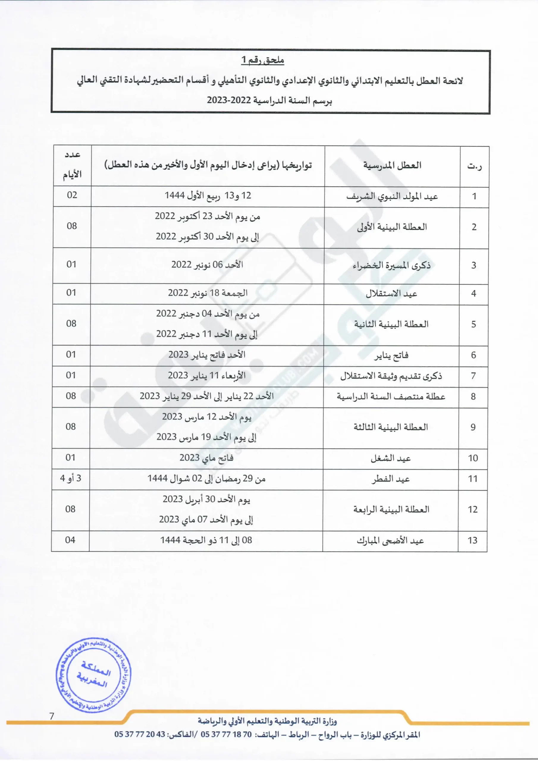 لائحة العطل بالتعليم الابتدائي و الثانوي الإعدادي و الثانوي التأهيلي و أقسام التحضير لشهادة التقني العالي برسم السنة الدراسية 2022-2023.