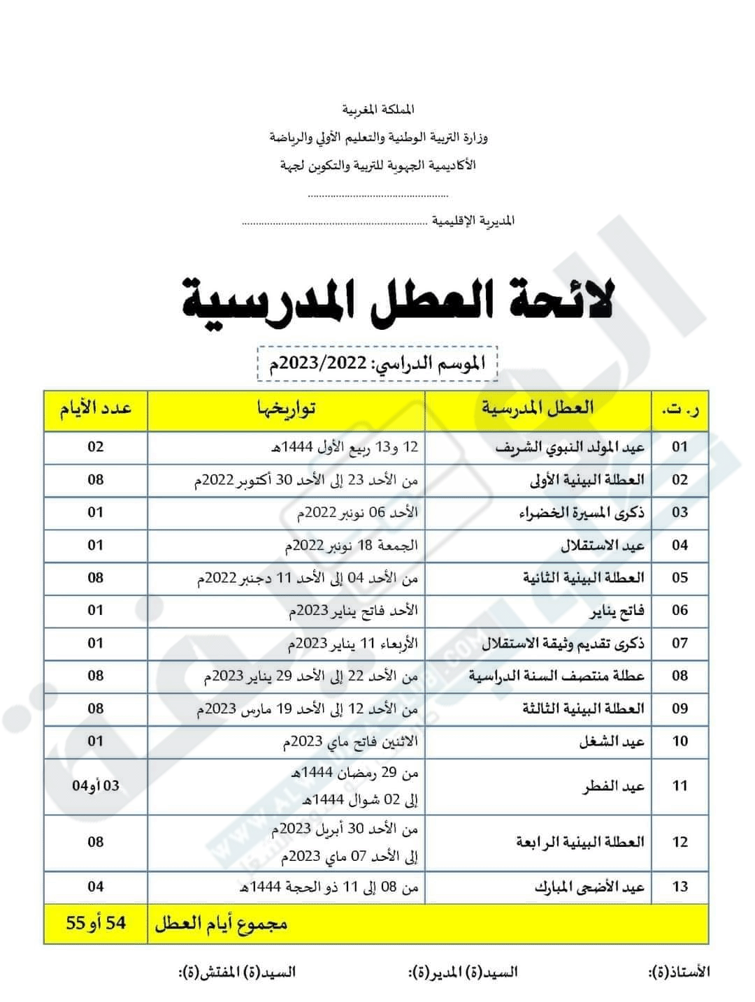 كما أن لائحة العطل 2023-2022 المدرسية الجديدة عرفت 54 يوما موزعة بين العطل الوطنية والدينية حيت جاءت لائحة العطل المدرسية على الشكل التالي: