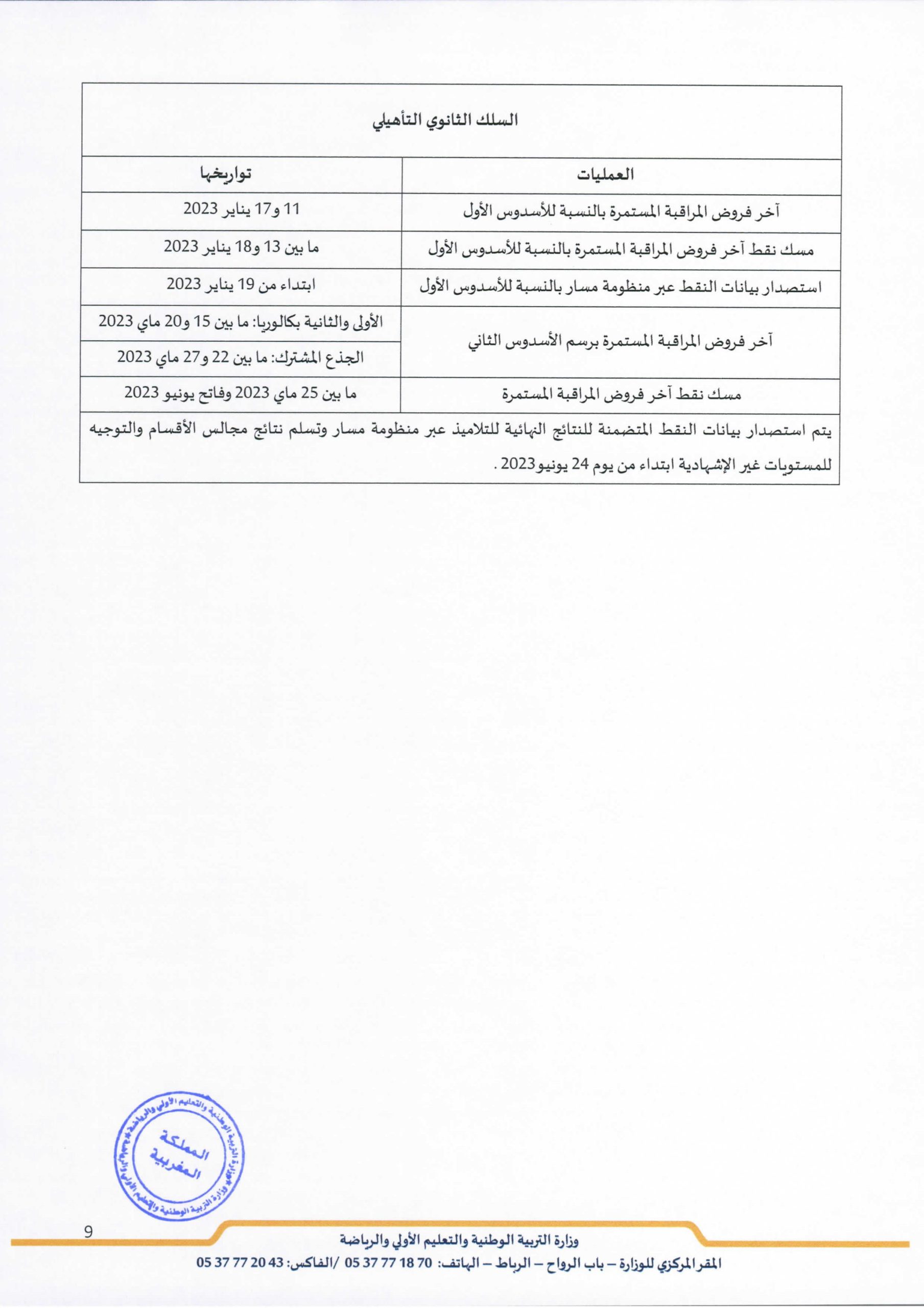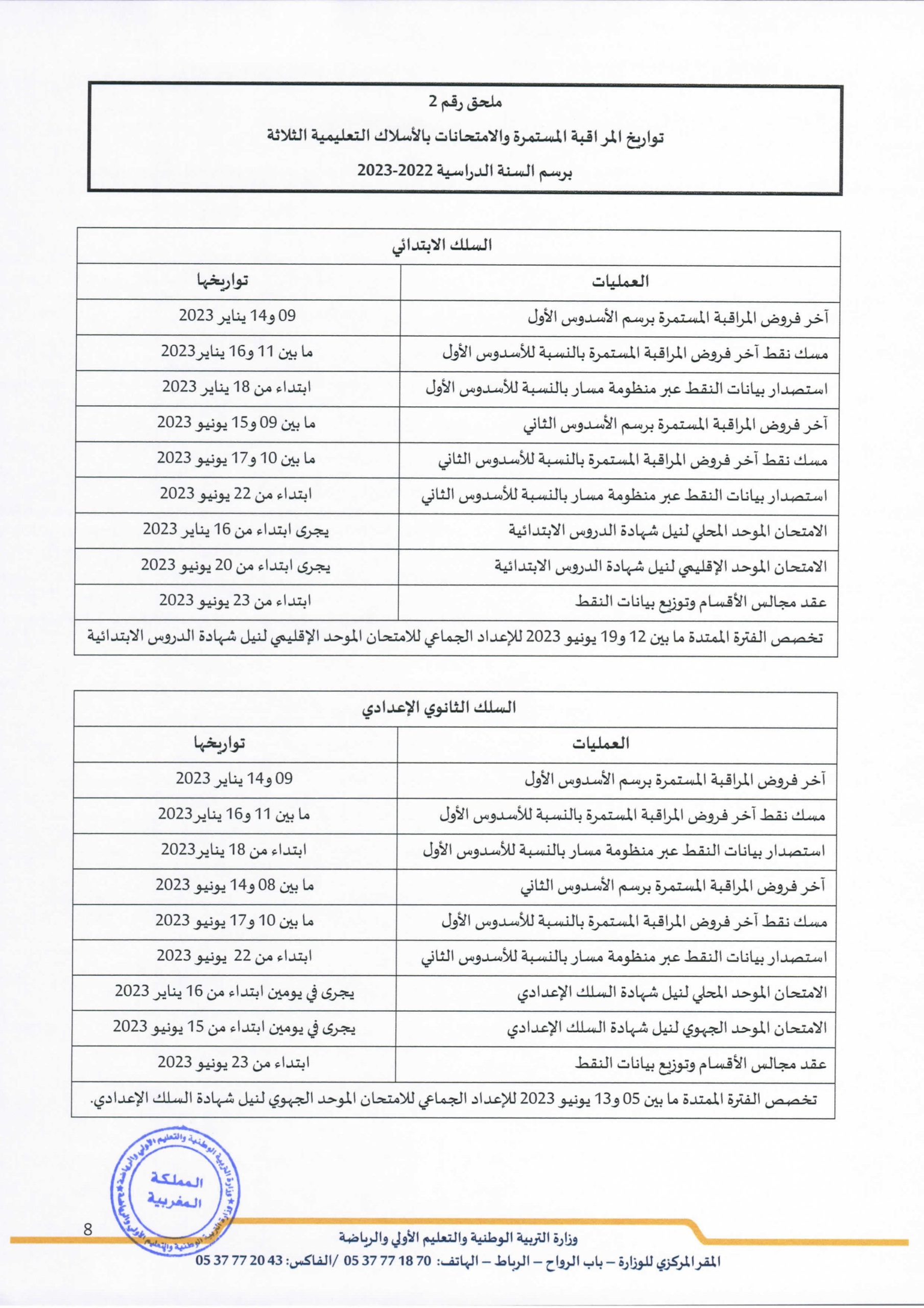 تواريخ إجراء المراقبة المستمرة والامتحانات الموحدة 2023 تواريخ إجراء المراقبة المستمرة والامتحانات الموحدة 2023