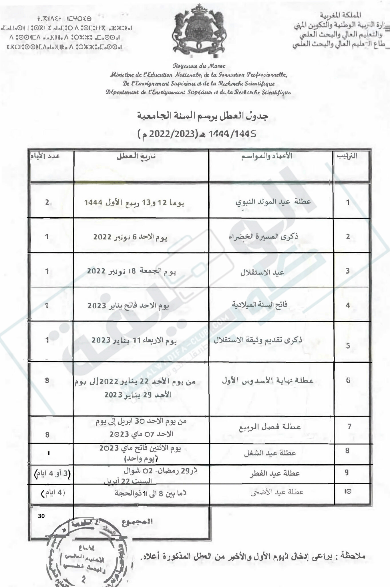 بالإضافة إلى لائحة العطل الجامعية للموسم الجامعي 2022-2023 و عطل التكوين المهني برسم السنة التكوينة 2022-2023.
