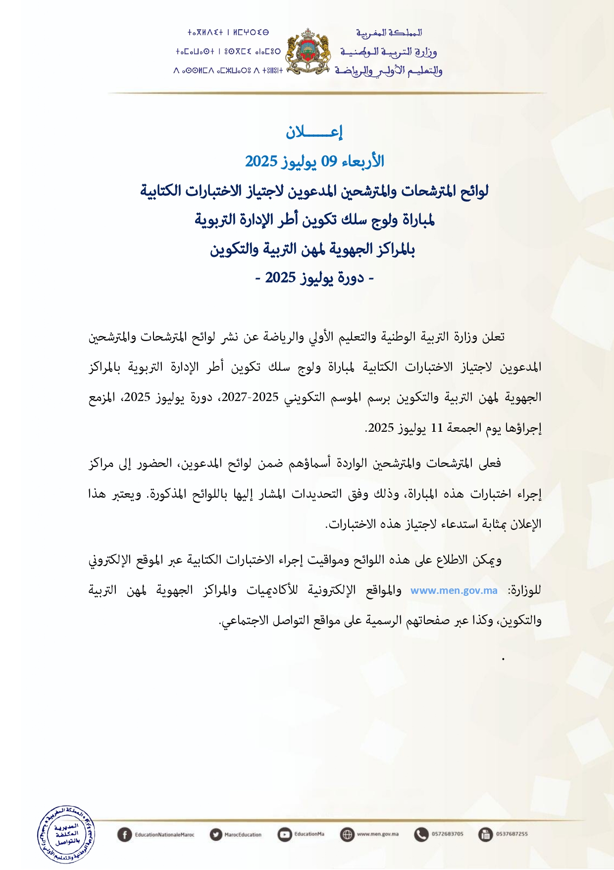 أعلنت وزارة التربية الوطنية والتعليم الأولي والرياضة عن نشر لوائح المترشحات والمترشحين المدعوين لاجتياز الاختبارات الكتابية لمباراة ولوج سلك تكوين أطر الإدارة التربوية برسم الموسم التكويني 2025-2027، دورة يوليوز 2025.