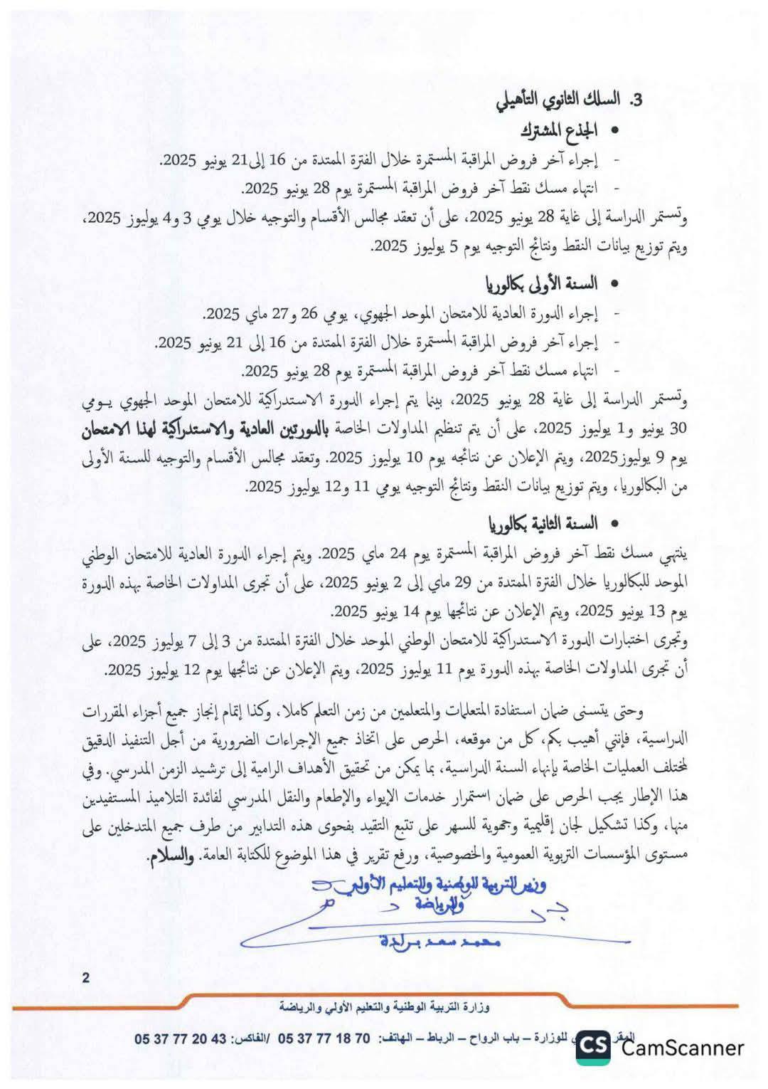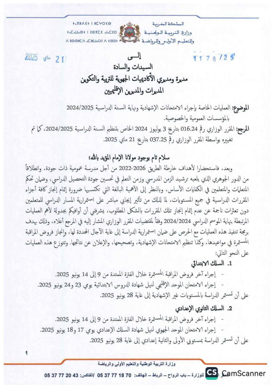 مراسلة وزارية العمليات الخاصة بإجراء الامتحانات الإشهادية ونهاية السنة الدراسية 2024 – 2025