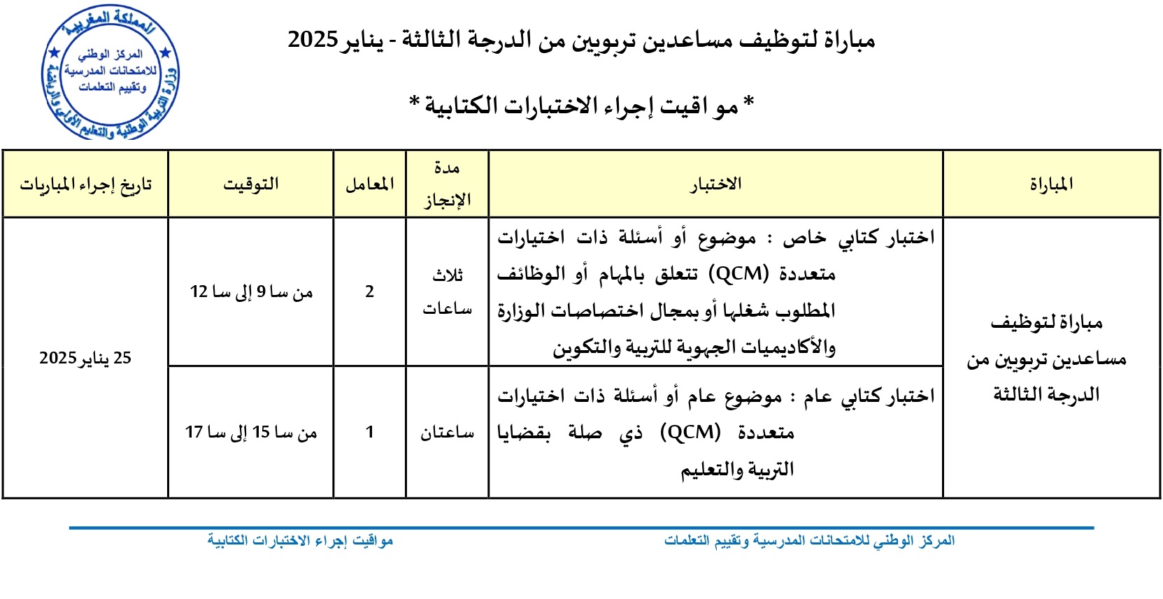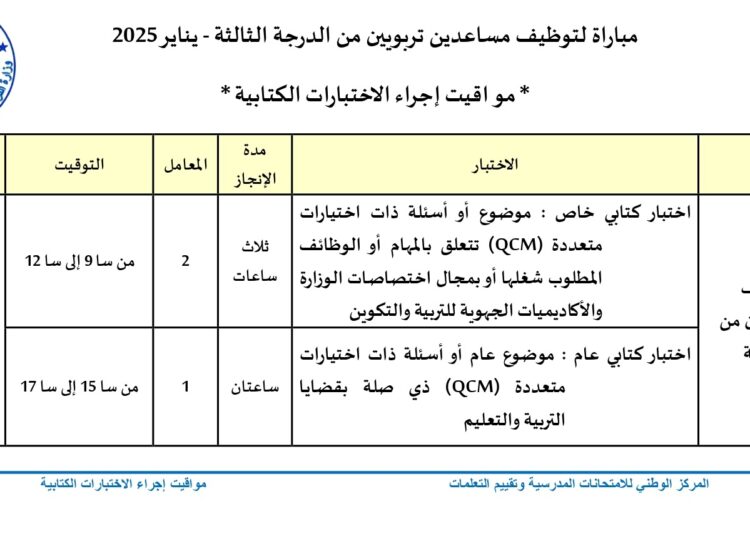 مواقيت إجراء الاختبارات الكتابية لمباراة توظيف مساعدين تربويين من الدرجة الثالثة- دورة يناير 2025