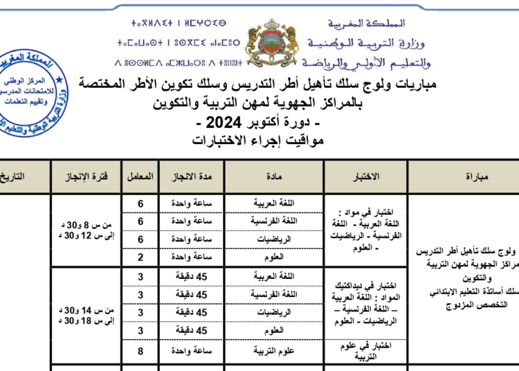 تاريخ ومواقيت إجراء الاختبارات الكتابية لمباراة التعليم 2024: تاريخ ومواقيت إجراء الاختبارات الكتابية مباريات ولوج سلك تأهيل أطر التدريس وسلك تكوين الأطر المختصة بالمراكز الجهوية لمهن التربية والتكوين – دورة أكتوبر 2024.