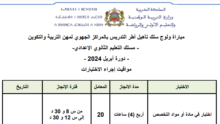 مواقيت إجراء مباراة ولوج سلك تأهيل أطر التدريس بالمراكز الجهوية لمهن التربية والتكوين- مسلك التعليم الثانوي الاعدادي- – دورة أبريل 2024.