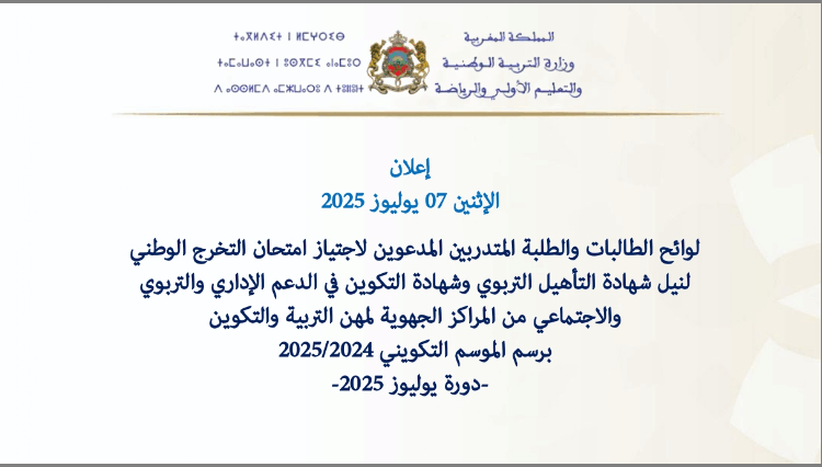 تعلن وزارة التربية الوطنية والتعليم الأولي والرياضة عن نشر لوائح الطالبات والطلبة المتدربين المدعوين لاجتياز امتحان التخرج الوطني لنيل شهادة التأهيل التربوي وشهادة التكوين في الدعم الإداري والتربوي والاجتماعي من المراكز الجهوية لمهن التربية والتكوين برسم الموسم التكويني 2024/ 2025 – دورة يوليوز 2025.