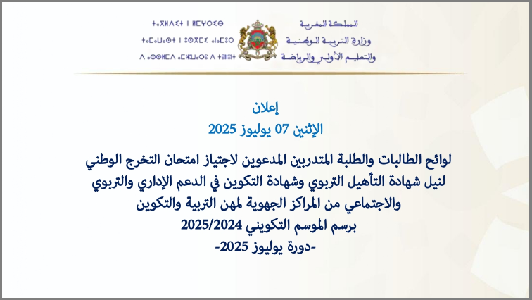 تعلن وزارة التربية الوطنية والتعليم الأولي والرياضة عن نشر لوائح الطالبات والطلبة المتدربين المدعوين لاجتياز امتحان التخرج الوطني لنيل شهادة التأهيل التربوي وشهادة التكوين في الدعم الإداري والتربوي والاجتماعي من المراكز الجهوية لمهن التربية والتكوين برسم الموسم التكويني 2024/ 2025 – دورة يوليوز 2025.