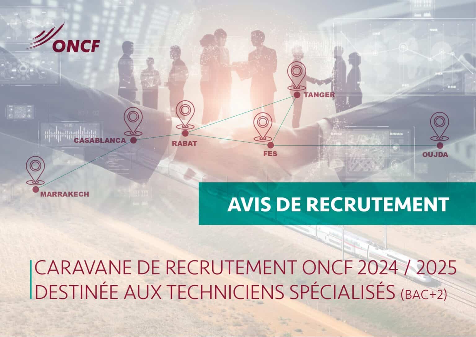في إطار تطوير وتعزيز فرق العمل، ينظم المكتب الوطني للسكك الحديدية (ONCF) قافلة توظيف مخصصة لتقنيين متخصصين من أفواج 2022، 2023، و2024. تهدف هذه المبادرة إلى اختيار كفاءات مؤهلة في المجالات التقنية والداعمة الاستراتيجية لدعم مهام المكتب.