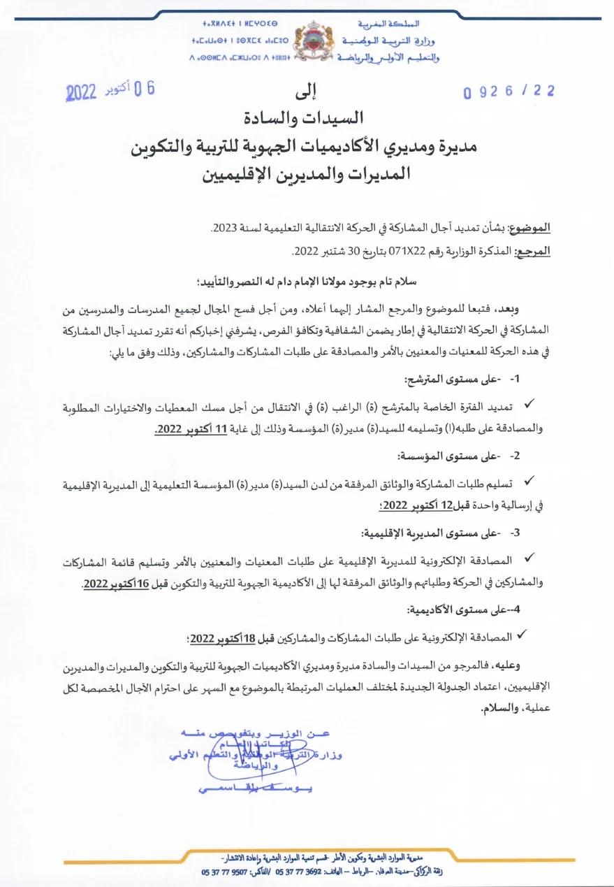 مذكرة رقم 22-071 بتاريخ 30 شتنبر 2022 في شأن الحركة الانتقالية التعليمية لسنة 2023 :