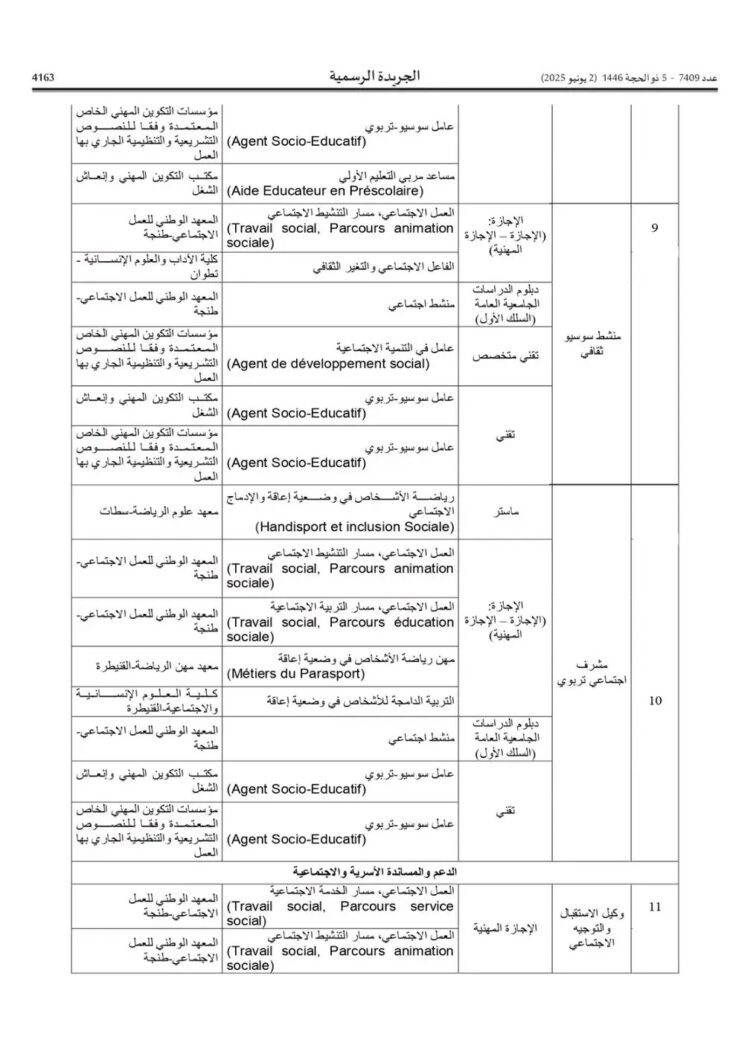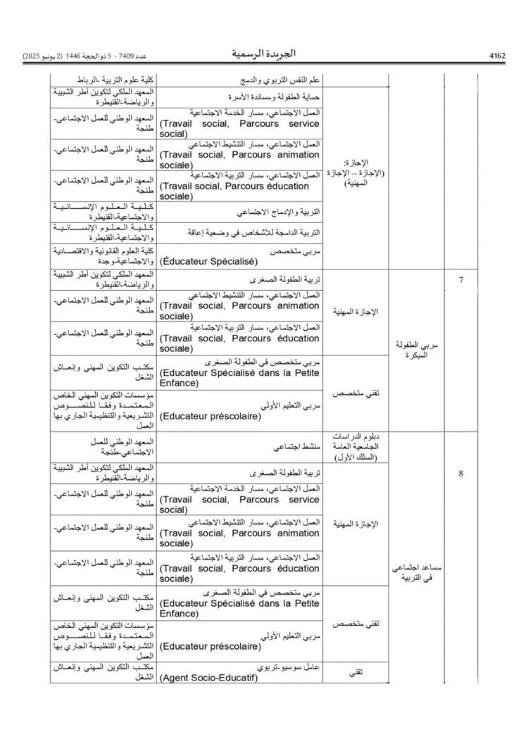 • فئة المغاربة الحاصلين على الشهادات أو الدبلومات المحددة قائمتها في قرار وزيرة التضامن والادماج الاجتماعي والأسرة رقم 827.25 صادر في 24 من رمضان 1446 (25 مارس 2025)، بتحديد قائمة الشهادات والدبلومات المطلوبة للحصول على الاعتماد لمزاولة مهنة العامل الاجتماعي، طبقاً لمقتضيات المادة 8 من القانون رقم 45.18 المتعلق بمهنة العاملات والعاملين الاجتماعيين.