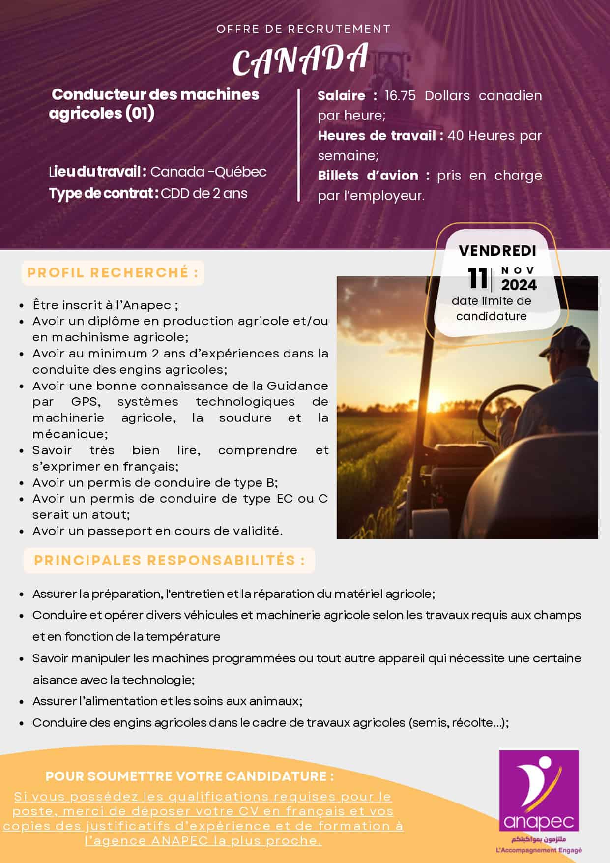Recrutement au Canada via l’Anapec: Conducteur de Machines Agricoles.