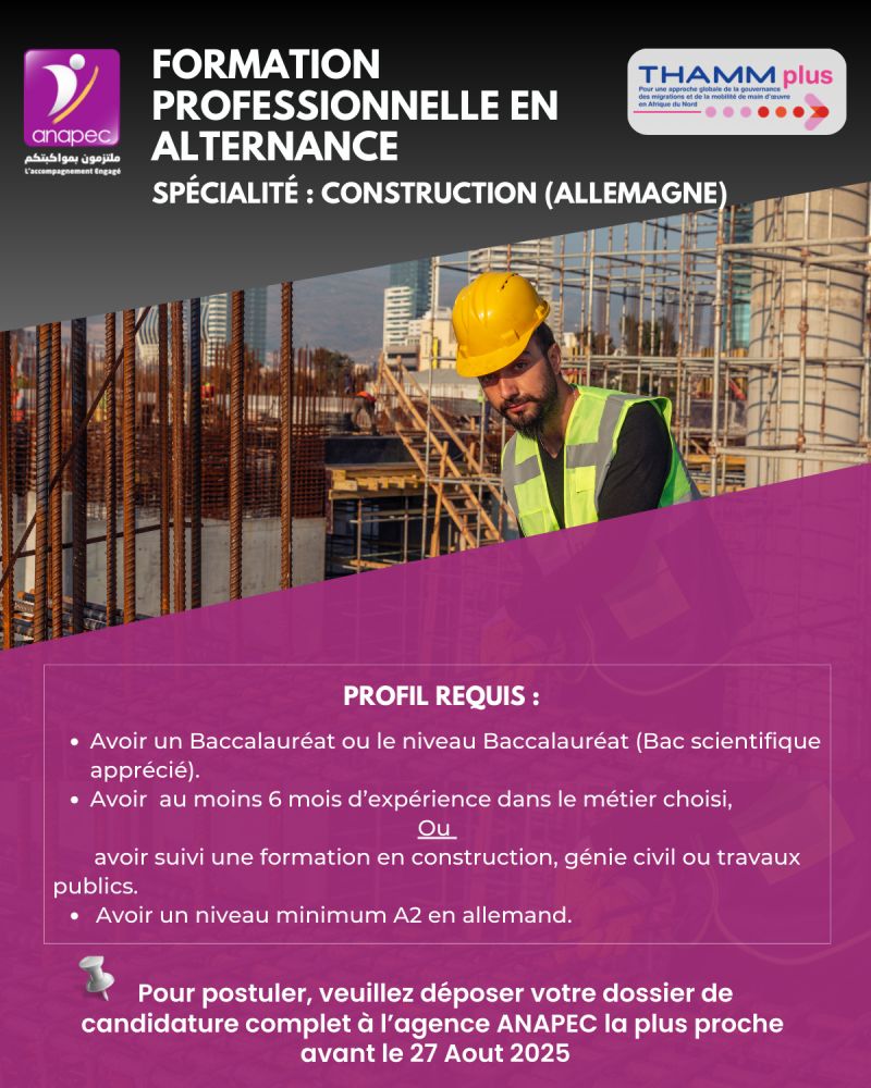 Dans le cadre d’un partenariat entre l’ANAPEC et le programme THAMM Plus de la GIZ, une opportunité unique est proposée aux jeunes Marocains pour une formation professionnelle en alternance dans le secteur de la construction en Allemagne. Ce programme est cofinancé par l’Union européenne et le Ministère Fédéral Allemand de la Coopération Économique et du Développement. L’initiative vise à soutenir l’employabilité des demandeurs d’emploi à l’international.