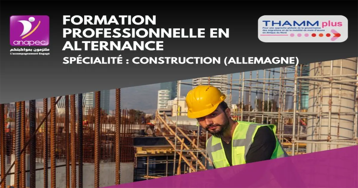 Dans le cadre d’un partenariat entre l’ANAPEC et le programme THAMM Plus de la GIZ, une opportunité unique est proposée aux jeunes Marocains pour une formation professionnelle en alternance dans le secteur de la construction en Allemagne. Ce programme est cofinancé par l’Union européenne et le Ministère Fédéral Allemand de la Coopération Économique et du Développement. L’initiative vise à soutenir l’employabilité des demandeurs d’emploi à l’international.