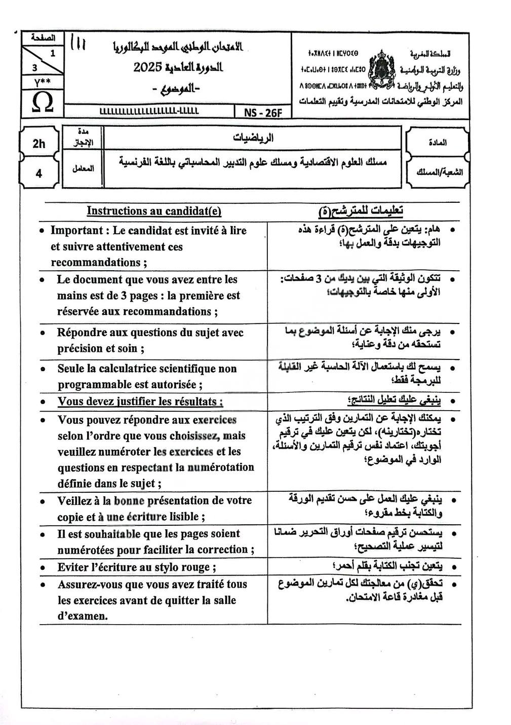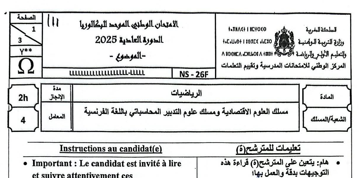 الامتحان الوطني الرياضيات 2025 مسلك العلوم الاقتصادية ومسلك التدبير المحاسباتي