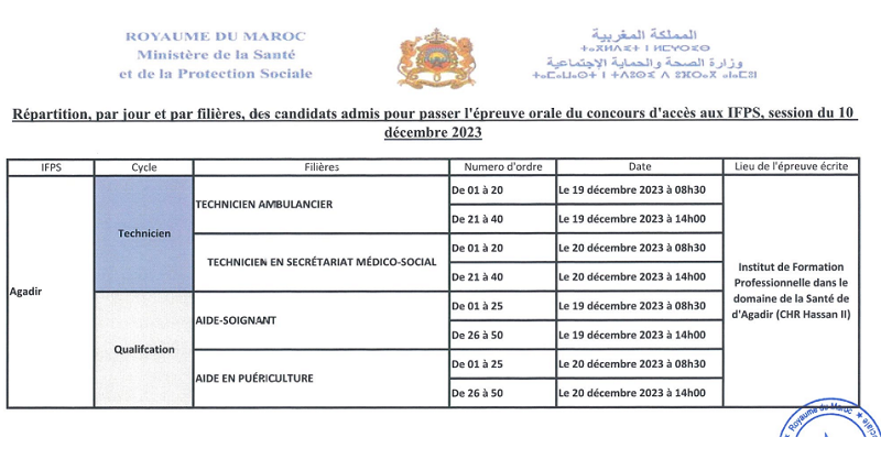 Il est porté à la connaissance des candidats dont les noms figurent sur les listes ci-jointes, qu’ils sont convoqués les 19, 20, 21 et 22 décembre 2023 pour passer l’épreuve orale du concours d’accès aux Instituts de Formation Professionnelle dans le domaine de la Santé, session du 10 décembre 2023