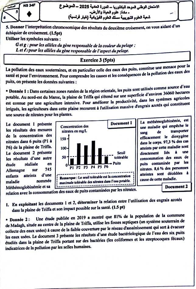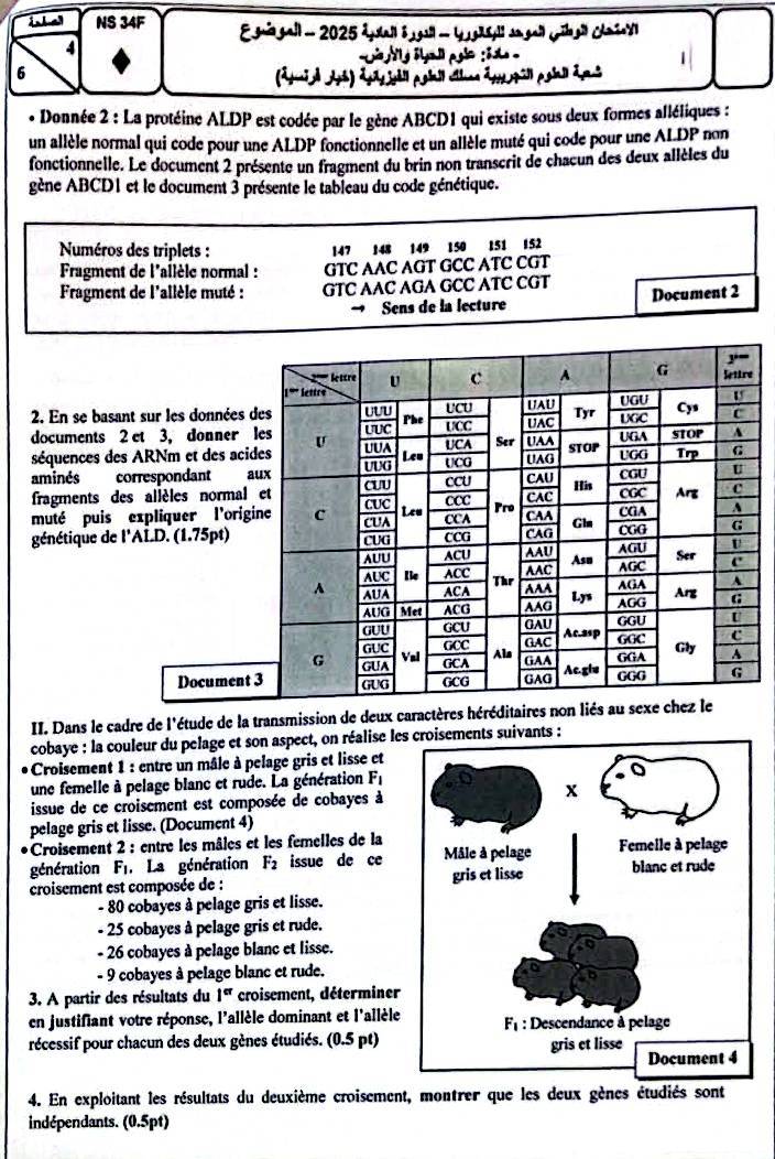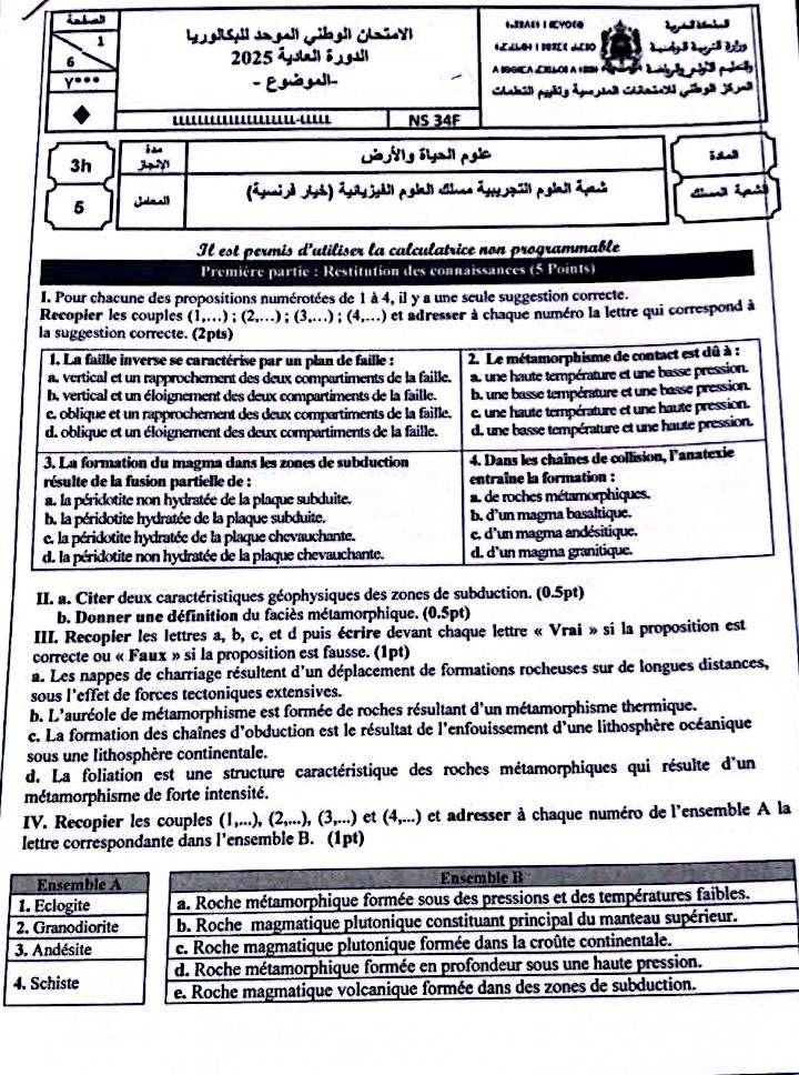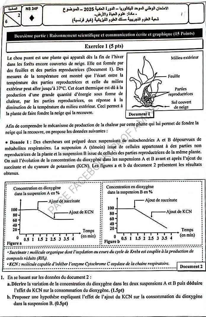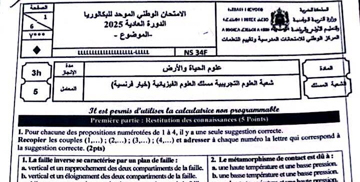 الامتحان الوطني مادة علوم الحياة والارض 2025 شعبة العلوم التجريبية مسلك العلوم الفيزيائية خيار فرنسية
